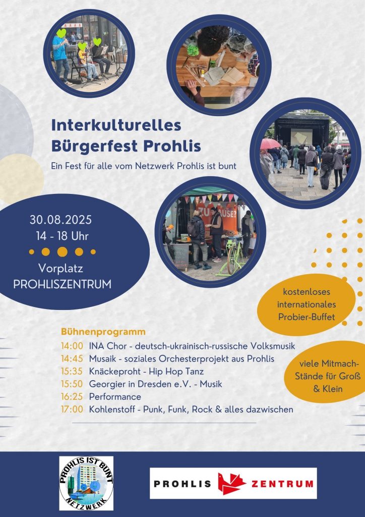 Am Samstag, 30.08.2025 wird das inzwischen schon zur Tradition gewordene „Interkulturelle Bürgerfest Prohlis“ wieder auf dem Vorplatz des Prohliszentrums gefeiert. Bürgerinnen und Bürger aus Prohlis und ganz Dresden sind eingeladen, zusammenzukommen und gemeinsam den Tag zu verbringen. Dabei gibt es traditionell ein buntes Bühnenprogramm von großen und kleinen Menschen aus Prohlis und Dresden sowie ein Buffet zum Probieren – beides spiegelt die Vielfalt dieses Stadtteils wieder. Außerdem gibt es verschiedenen Stände mit Mitmachaktionen für alle Altersstufen.